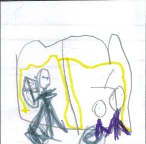 And I couldn’t stop laughing after my daughter brought home the story she’s been working on at school. Connecting letter sounds to words is still a chore, so I asked her to describe the first picture she drew: