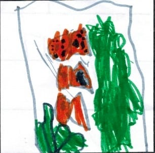 Again, my daughter has the right idea. The last picture is of Cici, Mickey, and Rainbow Sparkle, our fish who miraculously stayed alive while we were gone. “They’re happy we’re home,” she insists, pointing to her drawing.